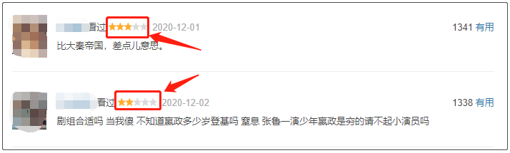 1)评论数随时间的变化趋势 从图中可以看出:短评数量在12月4日之前,一直处于上升趋势,在12月4日达到顶峰。和文章最开始的说明一致,前面几天观众对于该剧的期待值较高,但是在12月4日后,突然出现断崖式下降,说明随着该剧的更新,大家有所失望了。