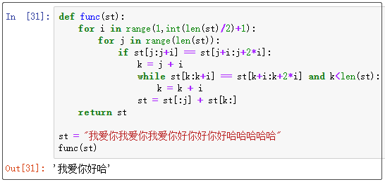 )+1 ): for j in range(len(st)): if st[j:j+i] == st[j+i:j+2 *i]: k = j + i while st[k:k+i] == st[k+i:k+2 *i] and k k = k + i st = st[:j] + st[k:] return st st = "我爱你我爱你我爱你好你好你好哈哈哈哈哈" func(st)