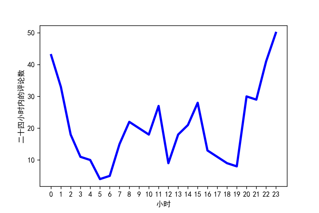 2)二十四小时内的评论数的变化趋势 最近总听到周围有人在讨论这部剧,下面就来看看大家都是在啥时候追剧呢?从24小时图中可以看出:晚上7-24点,评论急剧上升,大多数人都是6点下班,可能吃个饭到7点左右,或者直接在下班过程中,就开始了一天的追剧。这里还有一波早高峰5-8点,难道睡不着?早上还要起来刷刷据,然后上班。这里还有两个时间段:上午10-11点,中午12-15点,大家可以分析下,肯定有相当一部分小伙伴,正在摸鱼工作呀🤭