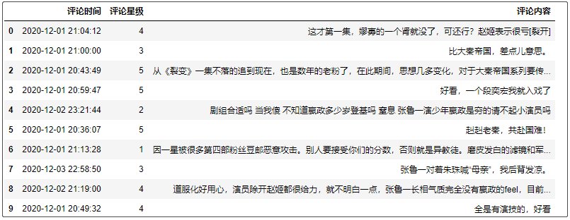 2)评论时间处理 因为《大秦赋》是2020年12月1号开播的,现在是12月16号晚,因此所有的评论数据肯定都是2020年12月开始有的,因此我们只保留有用的“日期”数据(哪一天)。而对于时分秒来说,我们只保留“小时”数据。