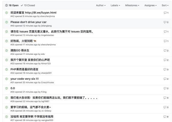 除了刷星,GitHub 上还有各种各样博关注的“骚操作”:垃圾项目刷屏、把项目的 issue 功能当作论坛版聊天(原功能是用来反馈 bug 的),比如去年大量中国开发者刷屏 Node 之父 Ryan Dahl 的新项目: