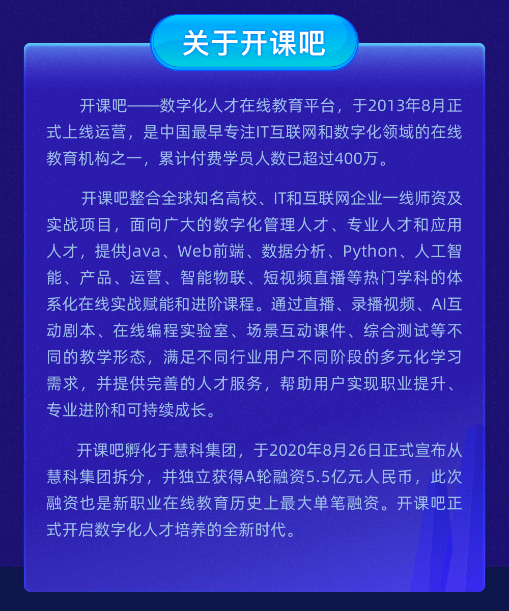 对于一个教育机构来说,找几个老师很容易,做几个课程内容也很容易,但是重要的是课程的体系和结构,以及训练的整体过程,这个是很难复制的。开课吧的课程内容久经考验,培育的学员中,80%成功拿到了offer,也向大家说明了实力。