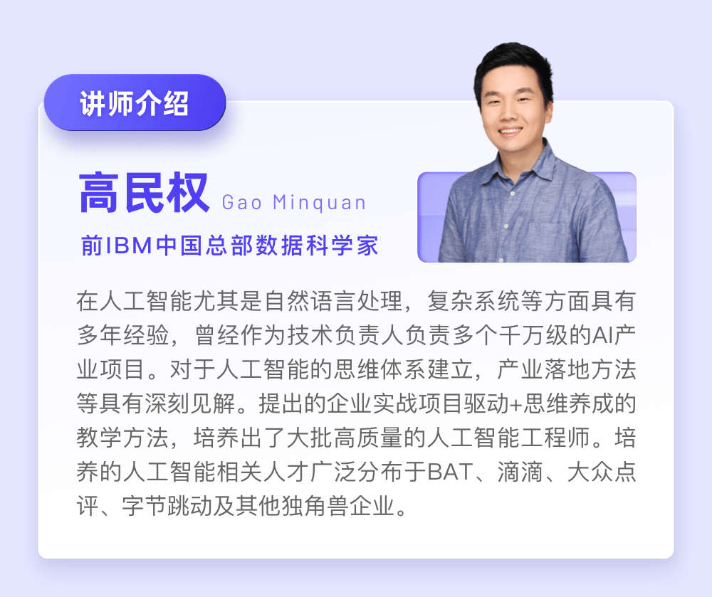 这次训练营的讲师是高民权老师,他从2018年至今,培养过诸多AI算法工程师,如果只算BAT、滴滴、字节跳动、微博、美团点评这些全国一线的企业,他的学生有超过50名就职在这些公司的算法岗位。入职后几乎很少有人跳槽或者被优化的,不少人现在也做到了技术leader这个级别。