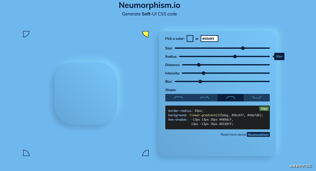Neumorphism 这个网站就是一个比较实用的现代拟物风格生成器。你无需借助 PS 或者 Ai,只需要通过傻瓜式的操作就能轻松生成拟物风格的 UI。并且,可以直接复制其 CSS 代码。