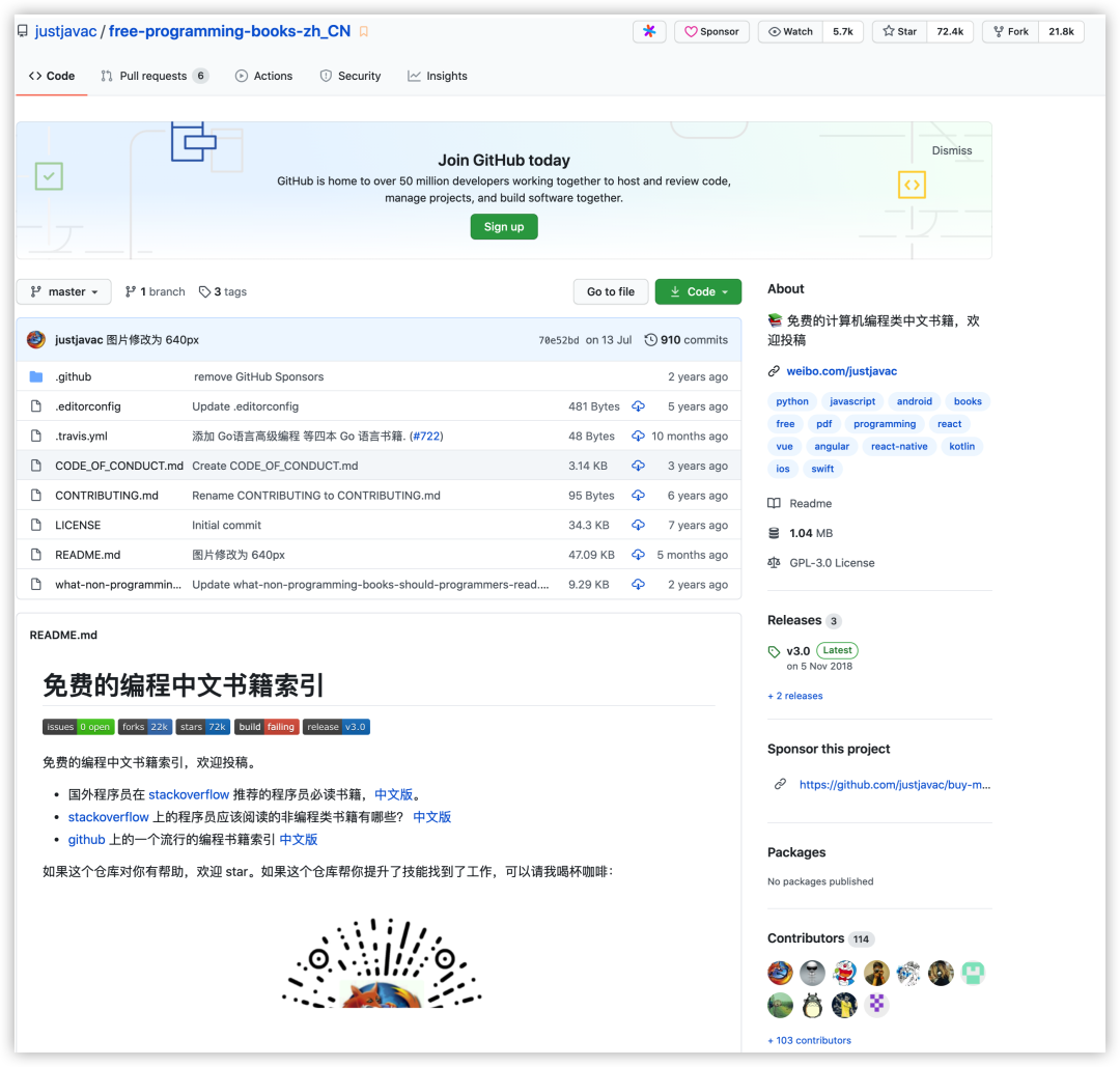 到目前为止,这个仓库在 GitHub 上已经有了 72.4k 的 star,自创建以来备受青睐,已经有了数百位贡献者来分享他们的电子书。