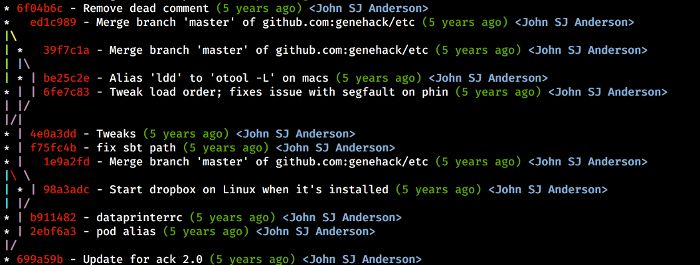 git log --graph --pretty=format:'%Cred%h%Creset -%C(yellow)%d%Creset %s %Cgreen(%cr) %C(bold blue)%Creset' --abbrev-commit --date=relative