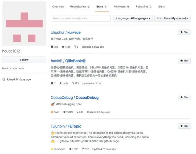 都不想再多截图了,我随手按顺序看了几个用户都这样,有没有发现一个共同点,他们都 star 了QilinBaoleiji,CocoaDebug,FETopic。而且是:有且只 star 了这几个项目。而且这个项目 fork 少的可怜。。。
