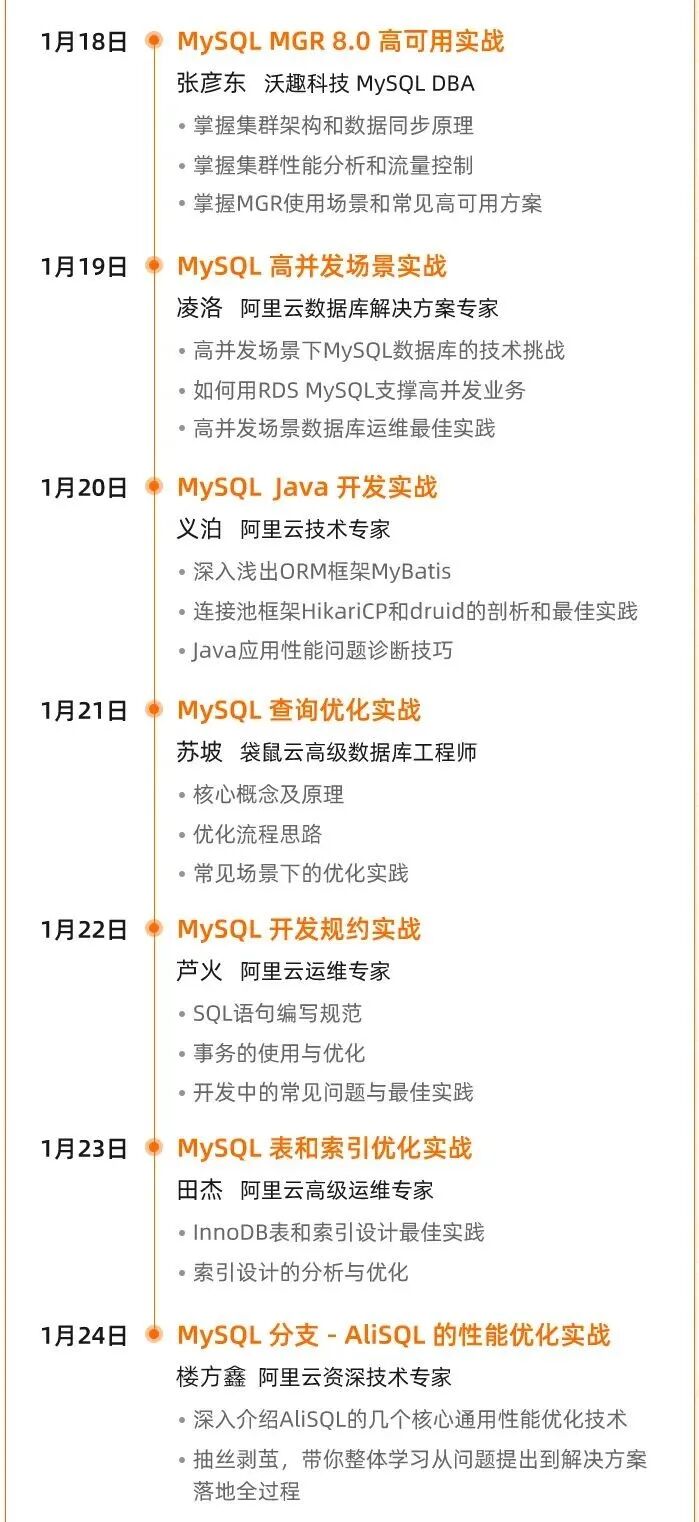 本次【七天深入MySQL实战营】由楼方鑫领衔,汇集阿里云数据库团队、袋鼠云和沃趣的中坚技术力量共同出品,总结了MySQL在大厂实战中的七个典型场景及最佳实践。