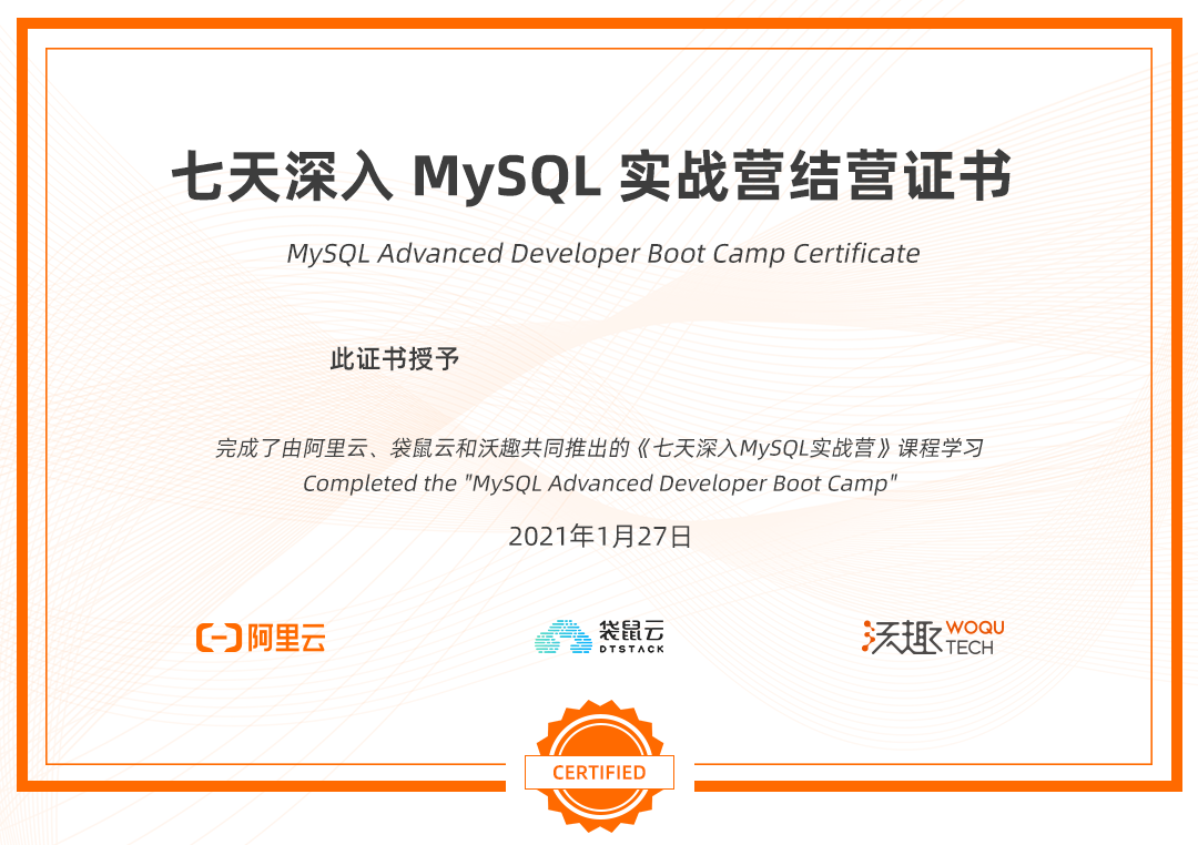 9.9元开通6个月MySQL学习环境,并完成七天打卡可以获得由阿里云、袋鼠云、沃趣共同颁发的结营证书。