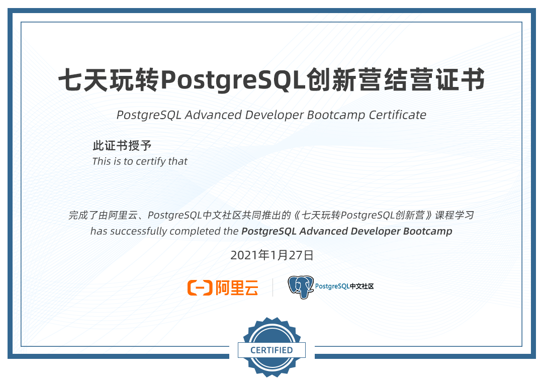 9.9元开通3个月PostgreSQL学习环境,并完成七天打卡可以获得由阿里云和PostgreSQL中文社区共同颁发的结营证书。