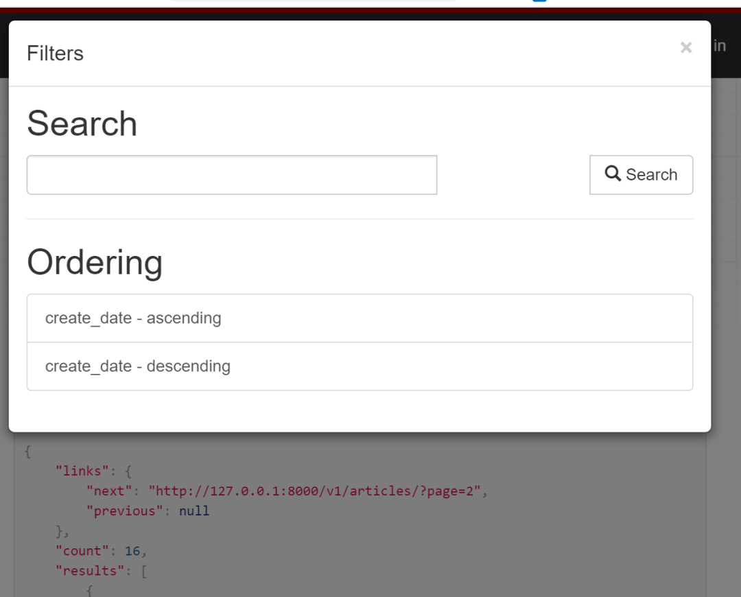 发送 GET 请求到 /v1/articles?page=1&search=django, 你将得到如下结果。