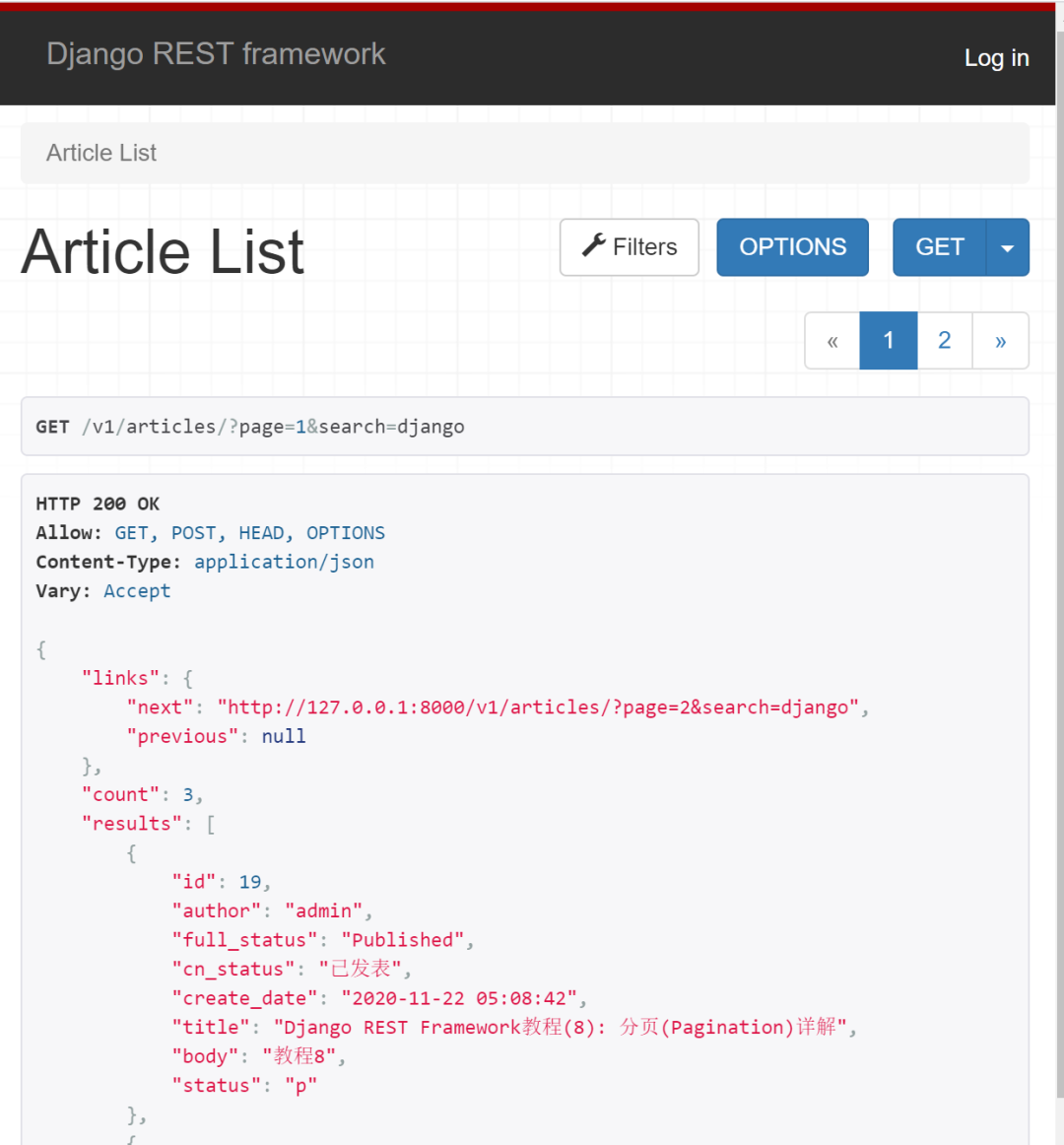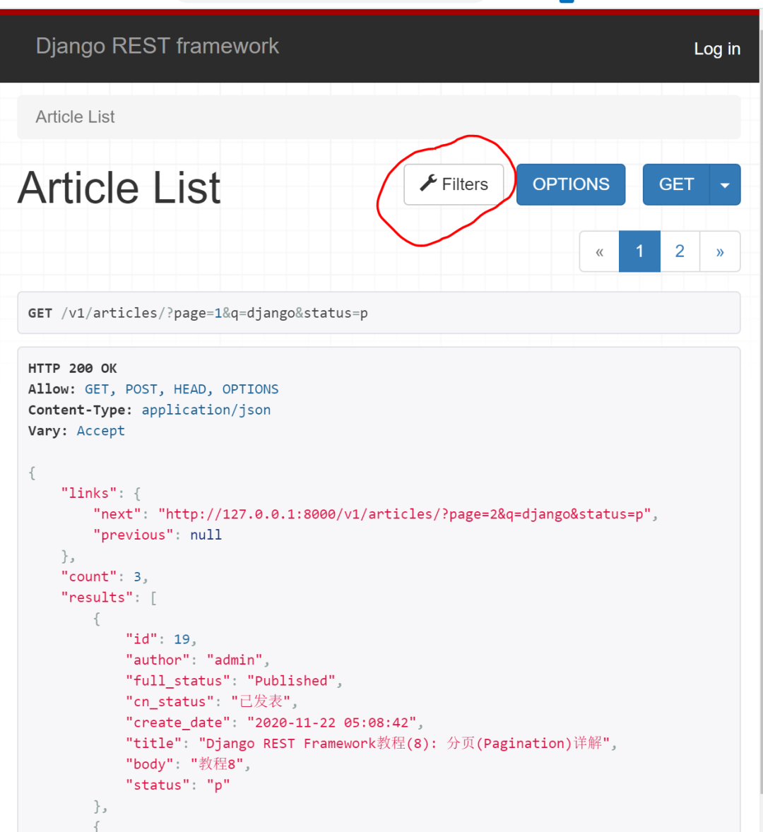 发送 GET 请求到 /v1/articles?page=2&q=django&status=p, 你将得到如下返回结果,只包含发表了的文章。