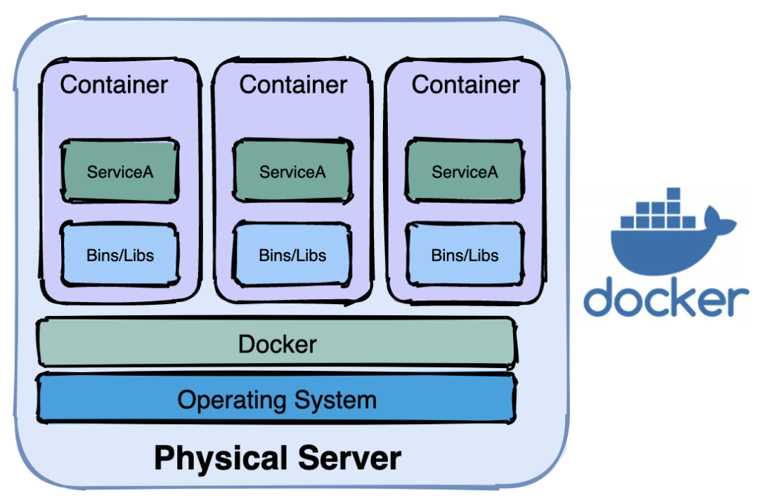 虚拟机时代(3)容器化时代:一台物理机安装多个容器实例(container),一个容器跑多个程序。