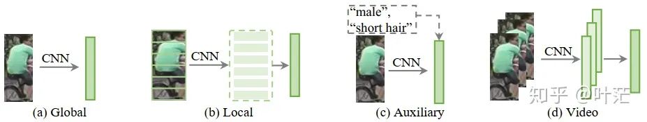 图 2. 四种主要的Re-ID特征学习方法 全局特征学习 :利用全身的全局图像来进行特征学习,常见的改进思路有Attention 机制,多尺度融合等; 局部特征学习 :利用局部图像区域(行人部件或者简单的垂直区域划分)来进行特征学习,并聚合生成最后的行人特征表示; 辅助特征学习 :利用一些辅助信息来增强特征学习的效果,如语义信息(比如行人属性等)、视角信息(行人在图像中呈现的不同方位信息)、域信息(比如每一个摄像头下的数据表示一类域)、GAN 生成的信息(比如生成行人图像)、数据增强等; 视频特征学习 :利用一些视频数据提取时序特征,并且融合多帧图像信息来构建行人特征表达 特定的网络设计:利用 Re-ID 任务的特性,设计一些细粒度,多尺度等相关的网络结构,使其更适用于 Re-ID 的场景。