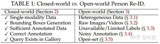 全文的综述和展望都是围绕这五个步骤来展开和讨论的。针对以上五个步骤的一些约束条件,本文将ReID技术分为 Closed-world 和 Open-world 两大子集。Closed-world 概括为大家常见的标注完整的有监督的行人重识别方法,Open-world 概括为多模态数据,端到端的行人检索,无监督或半监督学习,噪声标注和一些 Open-set 的其他场景。