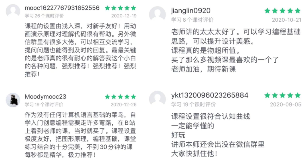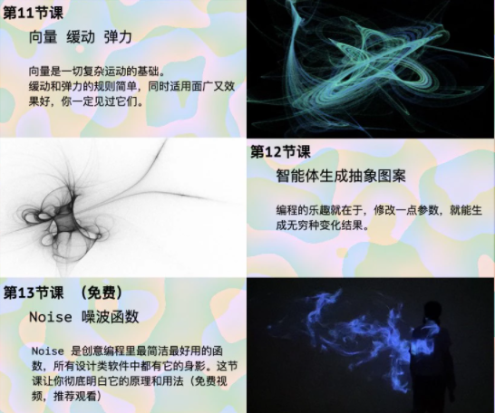 可能你会发现,目前Processing的中文学习资料还是比较少的,很多都还需要翻墙、翻译,所以这里也推荐网易云课堂一门做得比较用心的课程——《Processing艺术编程从入门到热爱》