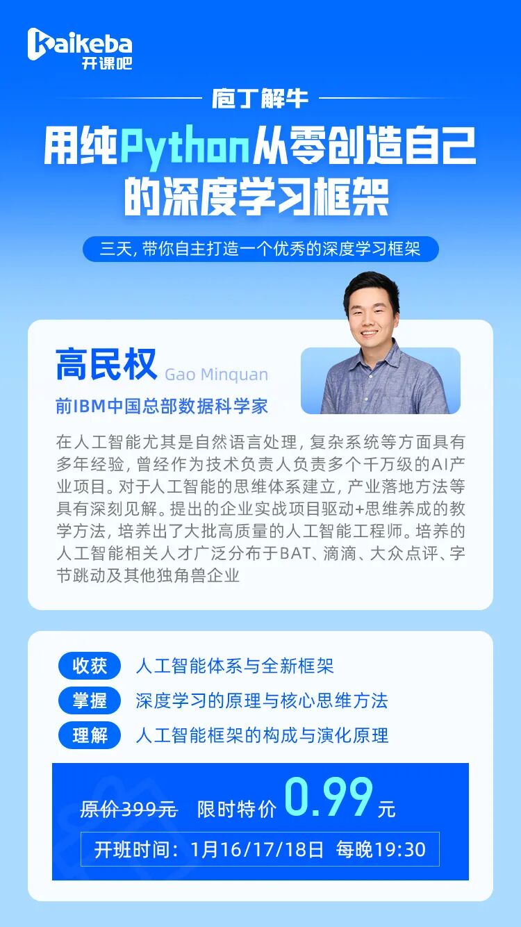 通过3天的《用纯Python从零创造自己的深度学习框架》,你可以一次性掌握深度学习框架搭建的原理,进一步探索激动人心的人工智能。