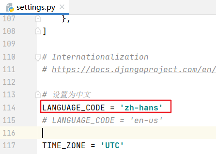再使用之前,需要将Django项目的settings.py的LANGUAGE_CODE设置为zh-hans