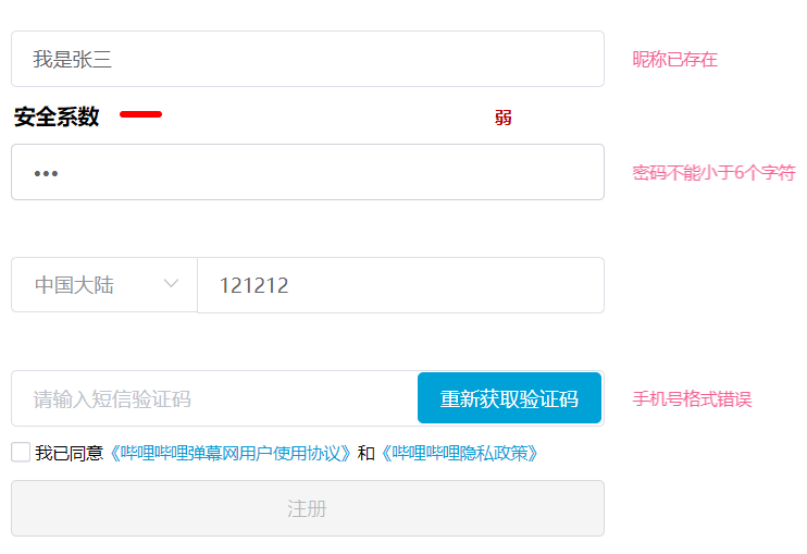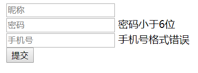 我点击注册,它不仅仅可以知道我的注册昵称是否存在,密码是否小于6位,手机号格式错误。