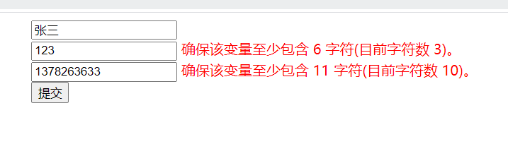 可以发现,即使刷新页面提交,还是会把原来的数据保存下来,并且还有验证失败的信息!