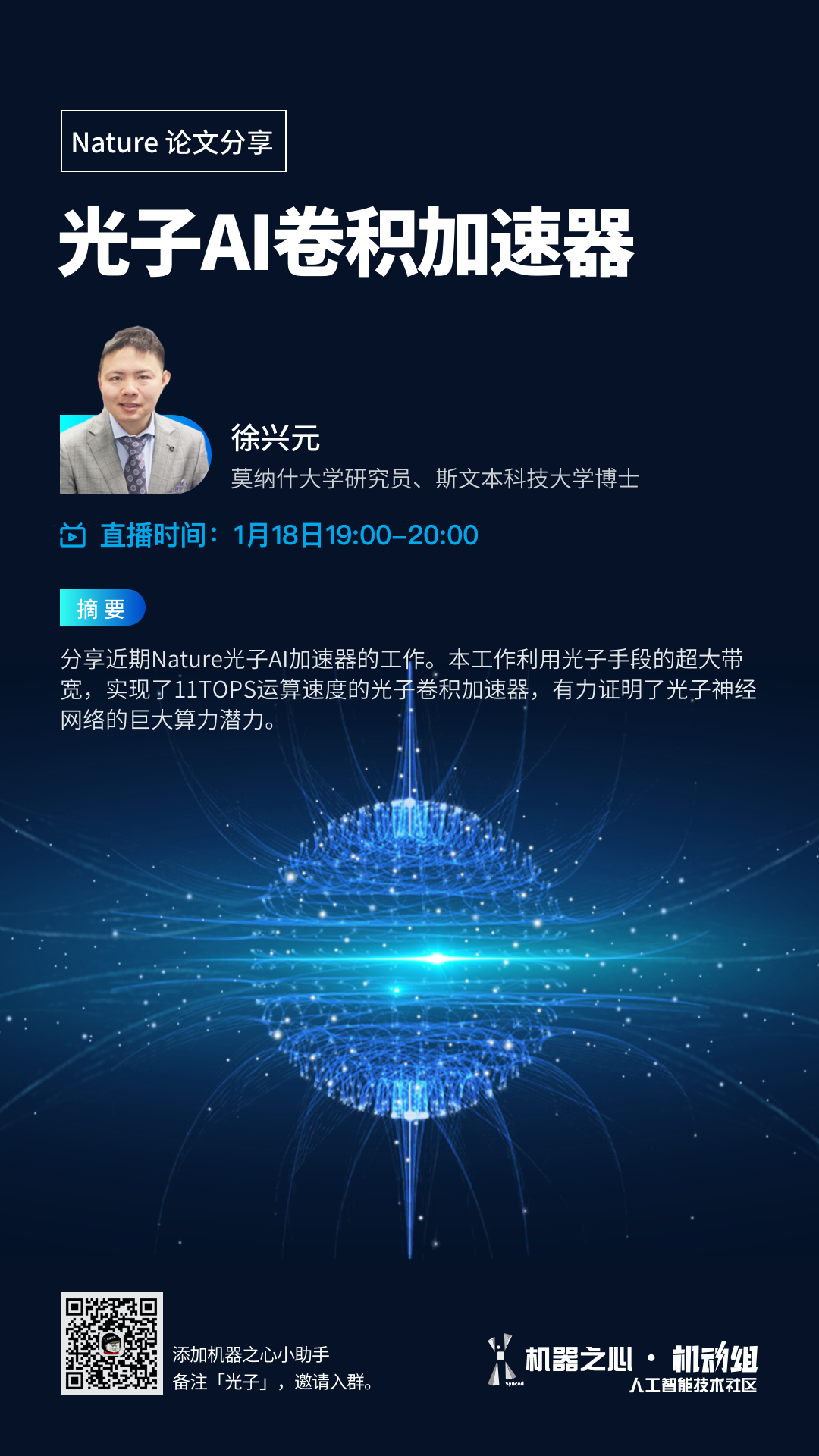 1月18日19:00,论文一作、莫纳什大学研究员徐兴元博士带来线上分享,详细介绍他们的工作以及光学芯片领域进展。添加机器之心小助手(syncedai5),备注「光子」,进群一起看直播。© THE END