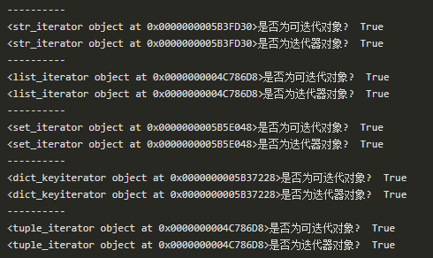 from collections.abc import Iterable, Iterator params = [ '1234' , [1 , 2 , 3 , 4 ], set([1 , 2 , 3 , 4 ]), {1 : 1 , 2 : 2 , 3 : 3 , 4 : 4 }, (1 , 2 , 3 , 4 ) ]for param in params: param = iter(param) print("----------" ) print(f'{param} 是否为可迭代对象? ' , isinstance(param, Iterable)) print(f'{param} 是否为迭代器对象? ' , isinstance(param, Iterator))