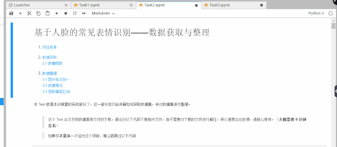 进入以后,页面往下拉动,你会发现本次深度学习训练营的三个任务,分别是深度学习基础知识;数据获取与整理;模型搭建、训练与测试