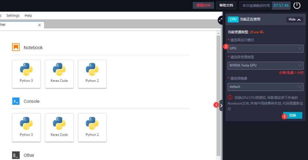 点击页面右侧小箭头,可以看到 GPU 的配置情况,点击切换,即可拥有免费的 GPU 算力,每次可以使用 8 小时,时间到了再开启,还有 8 小时,其实就相当于无限使用!
