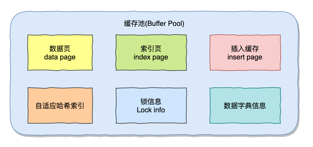 可以看到缓存池中包括数据页、索引页、插入缓存、自适应哈希索引、锁信息、数据字段。