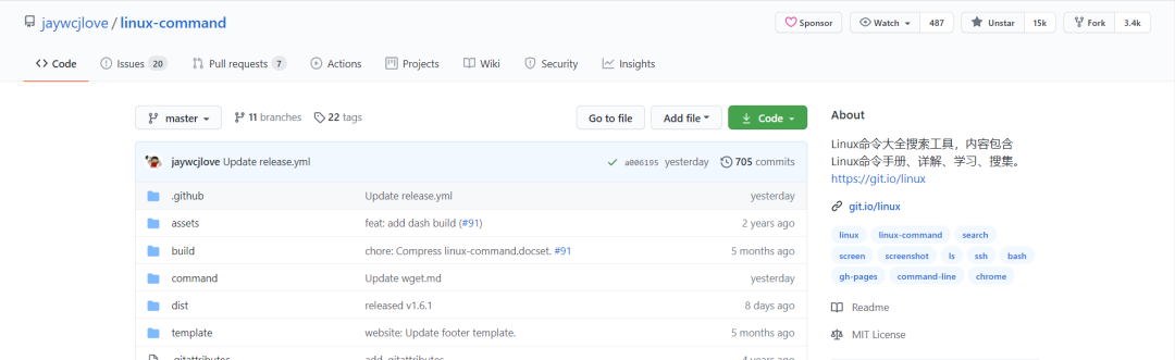 这个开源项目是 Linux 命令大全搜索工具,当前搜集了 570 多个 Linux 命令,主要内容包含:Linux 基础命令分类、Linux 学习资源整理(社区网站、知识相关、软件工具、开源镜像站点、游戏玩家发行版)等;