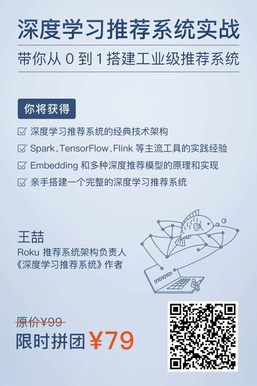 在专栏中,他讲解了深度学习推荐系统的经典架构设计,带你掌握 Embedding 技术的主要实现方法,构建完整的推荐系统评估体系路径,并搭建出一个工业级的深度学习推荐系统。