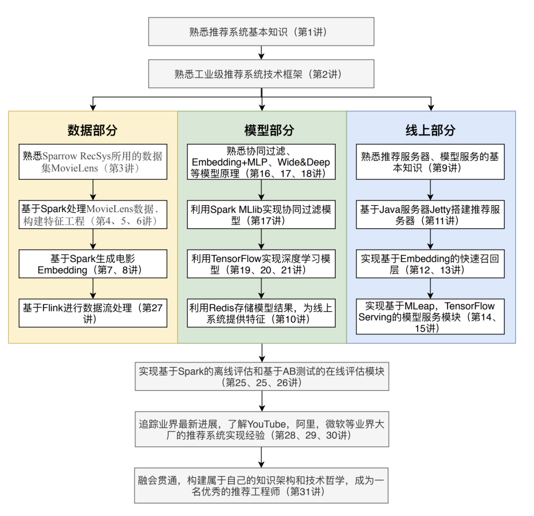 效果评估篇:学习效果评估的主要方法和指标,建立起包括线下评估、线上 AB 测试、评估反馈闭环等整套的评估体系,真正能够用业界的方法而不是实验室的指标来评价一个推荐系统。