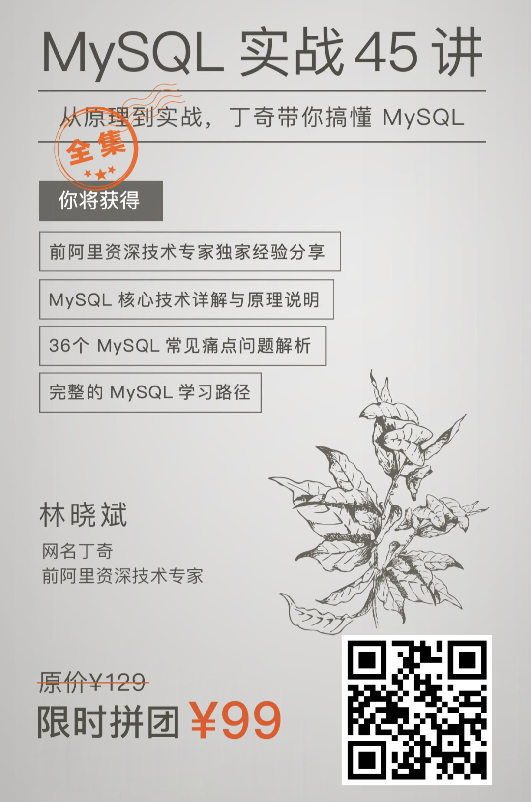 独收获,不如众收获。今天把这门口碑极好的专栏,推荐给你。专栏已经「全集」更新完毕,通过 45 篇文章,丁奇把 MySQL 底层原理和深坑讲得透透的,完全结合他的实战经验来写。