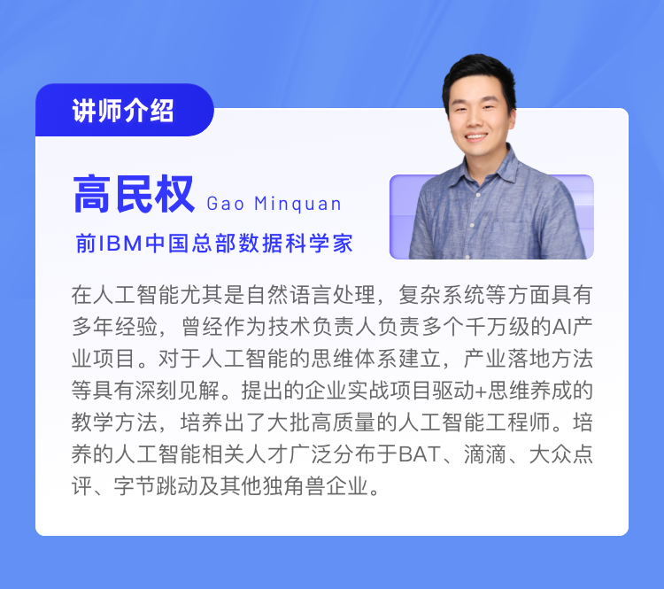 这次训练营的讲师是高民权老师,他从2018年至今,培养过诸多AI算法工程师,如果只算BAT、滴滴、字节跳动、微博、美团点评这些全国一线的企业,他的学生有超过50名就职在这些公司的算法岗位。入职后几乎很少有人跳槽或者被优化的,不少人现在也做到了技术leader这个级别。