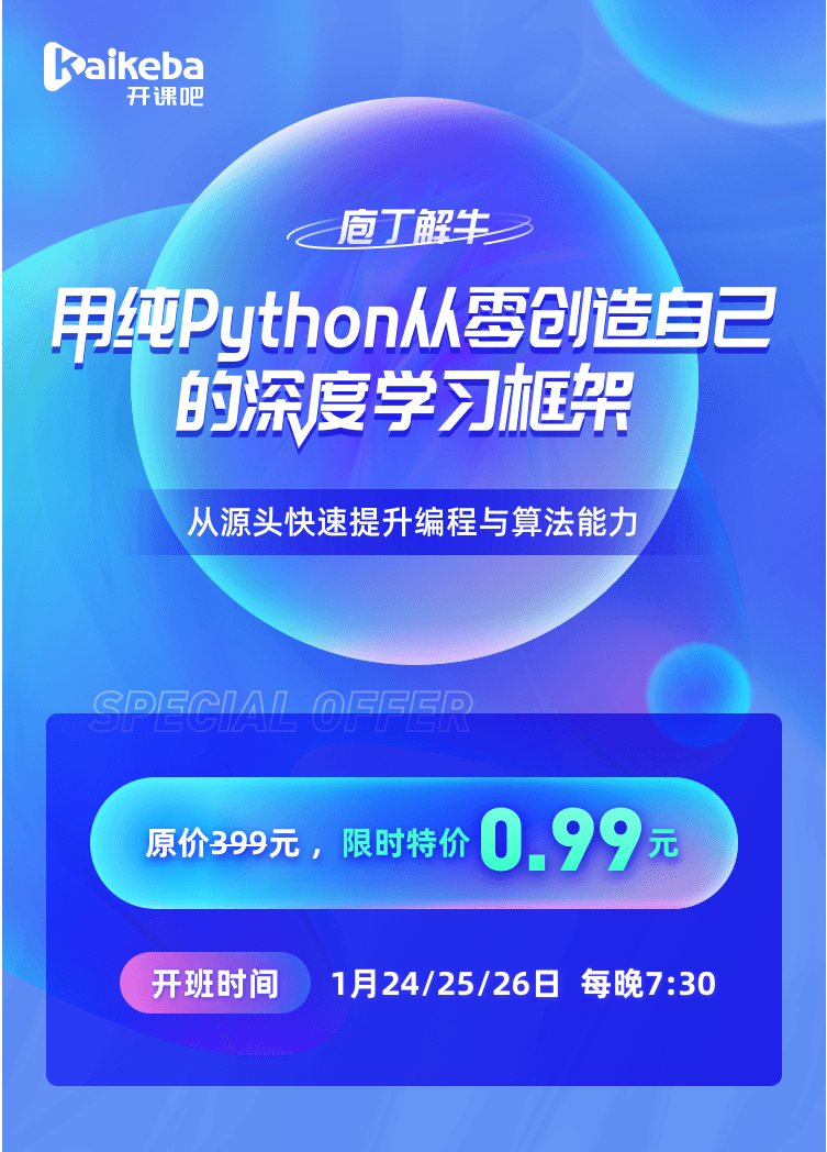 通过3天的《用纯Python从零创造自己的深度学习框架》,你可以一次性掌握深度学习框架搭建的原理,进一步探索激动人心的人工智能。