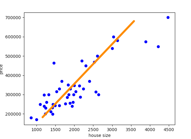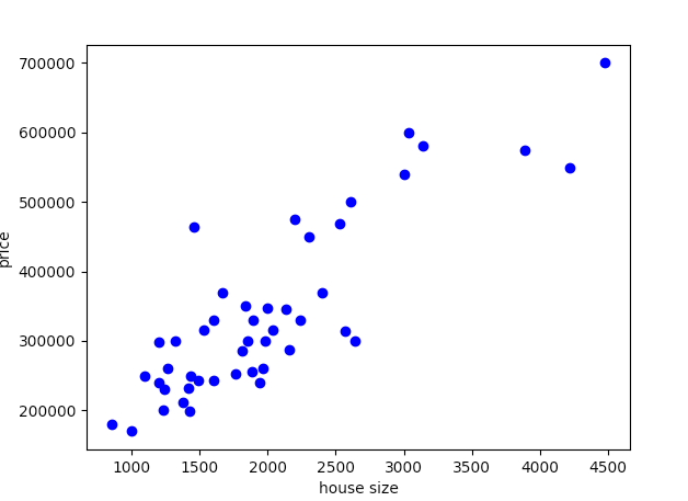 def plot_data(x, y): plt.xlabel('house size') plt.ylabel('price') plt.plot(x[:,0], y, 'bo') plt.show()