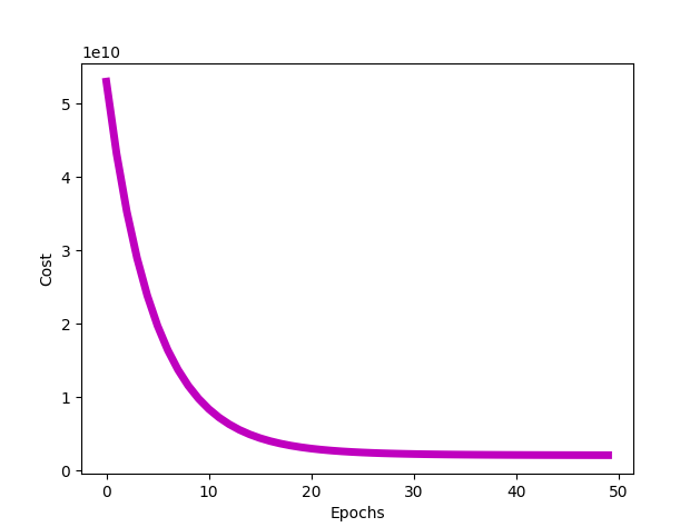 def plot_cost(J_all, num_epochs): plt.xlabel('Epochs') plt.ylabel('Cost') plt.plot(num_epochs, J_all, 'm', linewidth = "5") plt.show()