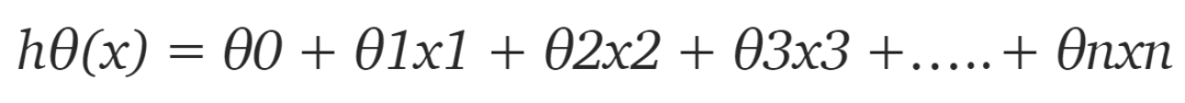 如上图所示,我们可以粗略地拟合一条线。这意味着使用线性近似能够做出较为准确的预测,因此可以采用线性回归。首先我们需要定义假设函数,稍后我们将使用它来计算代价。对于线性回归,假设是: