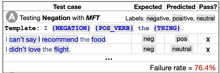 用于探索情感分析中否定性的理解的 CheckList 模板和测试(Ribeiro et al., 2020)。NLP 中的 SOTA 模型已在许多任务上实现了超越人类的表现,但我们能否相信这样的模型可以实现真正的自然语言理解(Yogatama et al., 2019; Bender and Koller, 2020)?其实,当前的模型离这个目标还很远。但矛盾的是,现有的简单性能指标无法体现这些模型的局限性。该领域有两个关键主题:a)精选当前模型难以处理的样例;b)不只是选择准确率等简单指标,而是进行更细粒度的评估。关于前者,常用的方法是在数据集创建过程中使用对抗过滤(Zellers et al., 2018),过滤出由当前模型正确预测的样例。最近的研究提出了更有效的对抗过滤方法(Sakaguchi et al., 2020; Le Bras et al., 2020)和一种迭代数据集创建处理方法(Nie et al., 2020; Bartolo et al., 2020),其中样例经过过滤,模型经过了多轮的重新训练。Dynabench 提供了此类不断变化的基准的子集。针对第二点的方法在本质上也是相似的。该领域通常会创建 minimal pairs(也称为反事实样例或对比集)(Kaushik et al., 2020; Gardner et al., 2020; Warstadt et al., 2020),这些 minimal pairs 以最小的方式干扰了样例,并且经常更改 gold label。Ribeiro et al. (2020) 在 CheckList 框架中形式化了一些基本的直觉,从而可以半自动地创建此类测试用例。此外,基于不同的属性来描述样例可以对模型的优缺点进行更细粒度的分析(Fu et al., 2020)为了构建功能更强大的机器学习模型,我们不仅需要了解模型是否优于先前的系统,还需要了解它会导致哪种错误以及还有哪些问题没被反映出来。通过提供对模型行为的细粒度诊断,我们可以更轻松地识别模型的缺陷并提出解决方案。同样,利用细粒度的评估可以更细致地比较不同方法的优缺点。