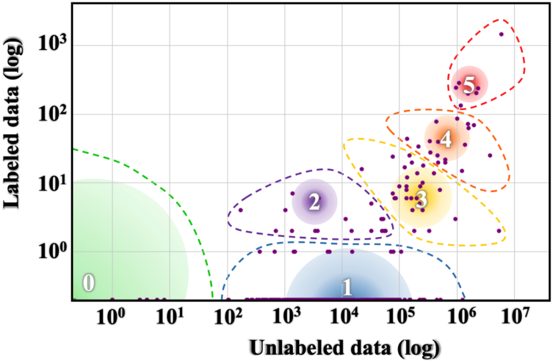 全球标记 / 未标记语言数据的不均衡分布情况(Joshi et al., 2020)。2020 年,多语言 NLP 有诸多亮点。旨在加强非洲语种 NLP 研究的 Masakhane 机构在第五届机器翻译会议 (WMT20) 上发表的主题演讲,是去年最令人鼓舞的演讲之一。此外,这一年还出现了其他语言的新通用基准,包括 XTREME (Hu et al., 2020)、XGLUE (Liang et al., 2020)、IndoNLU (Wilie et al., 2020)、IndicGLUE (Kakwani et al., 2020)。现有的数据集也拓展到了其他语言中,比如:SQuAD: XQuAD (Artetxe et al., 2020), MLQA (Lewis et al., 2020), FQuAD (d'Hoffschmidt et al., 2020);