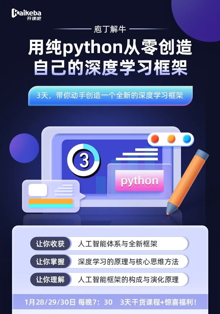 通过3天的《用纯Python从零创造自己的深度学习框架》,你可以一次性掌握深度学习框架搭建的原理,进一步探索激动人心的人工智能。