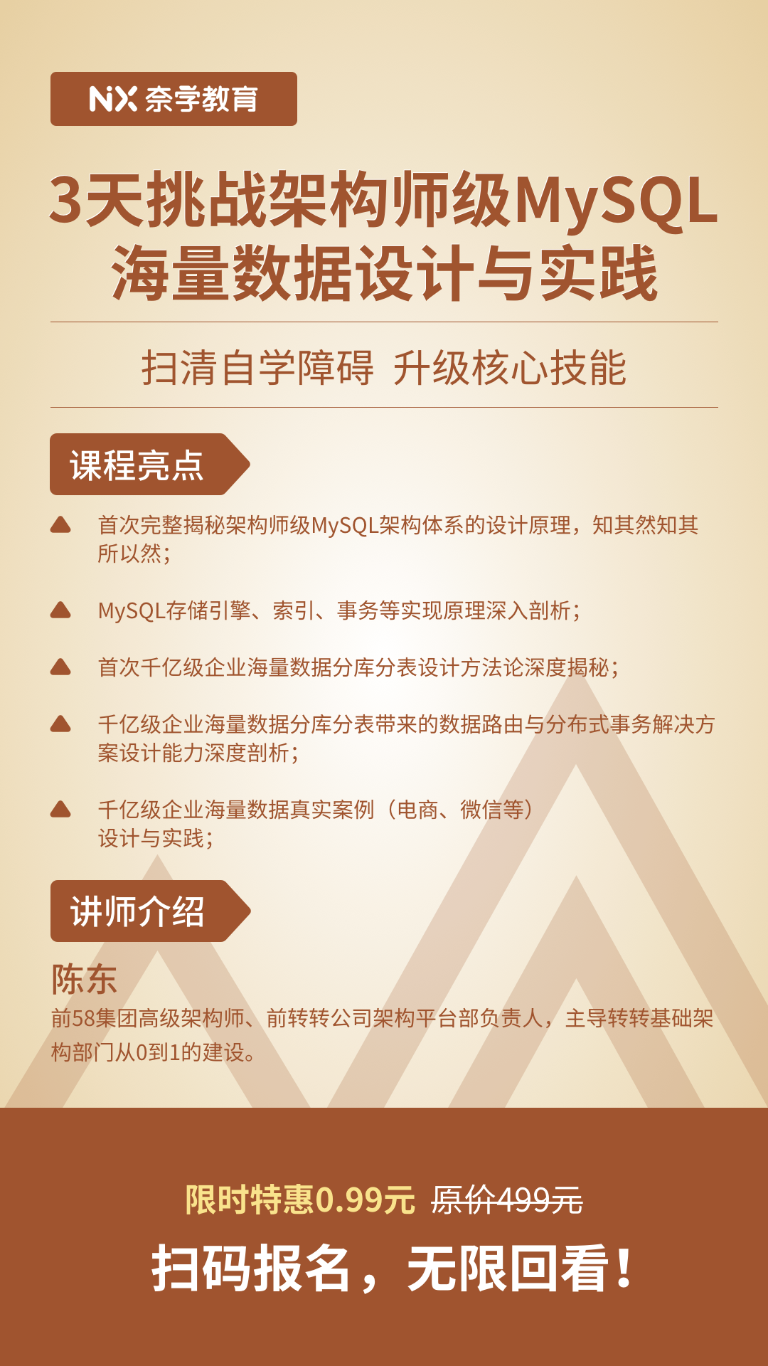 3大篇章15个模块构成,包括MySQL架构设计深入剖析篇、千亿级企业海量数据分库分表方法论提炼篇、千亿级企业海量数据真实案例设计与实践等核心实战内容,通过通俗易懂的企业案例式讲解,带你真正掌握架构师级MySQL海量数据设计与实践,从而在成为优秀架构师的路上越走越快!