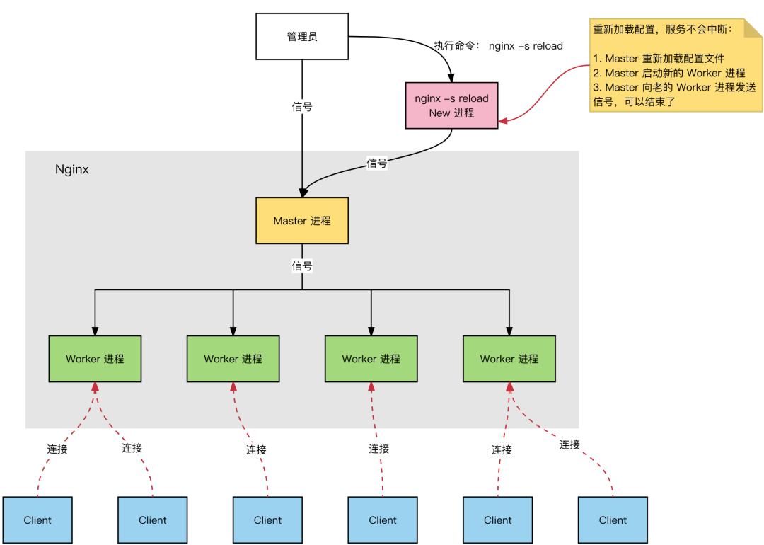 Nginx 作为反向代理服务器时,能够服务的最大连接数:(Worker 进程数量 x 单个 Worker 进程的最大连接数)/ 2。