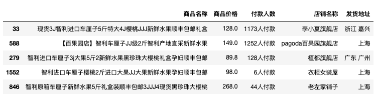 本文利用Python采集了淘宝网1585个商家车厘子销售数据,获取到车厘子的商品名称、商品价格、付款人数、店铺名称、发货地址等字段。限于篇幅,爬虫代码仅给出主函数: