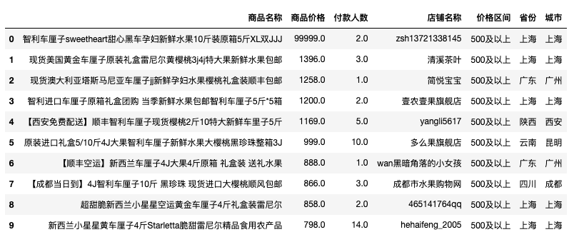 df = pd.read_csv('/菜J学Python/淘宝/车厘子.csv',header=None,