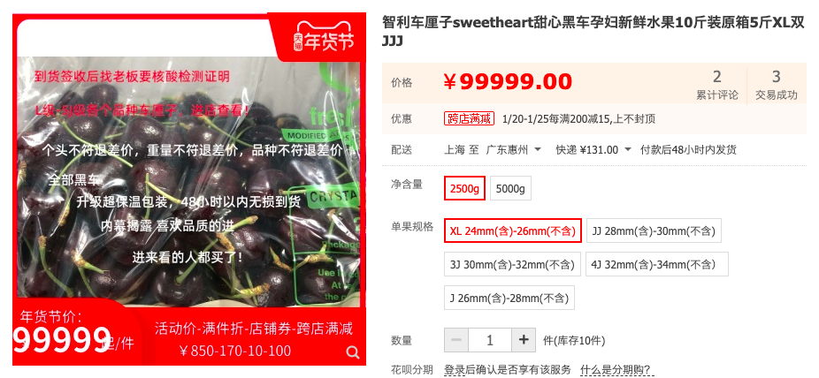 由上图可知,40%的车厘子价格在201-500元之间(淘宝挂牌价,非每斤价格),50元以下的车厘子占比不到4%,我表示有被贵到,你呢?如果你不嫌贵,那我帮你找到一家,可能符合你的需求,如下: