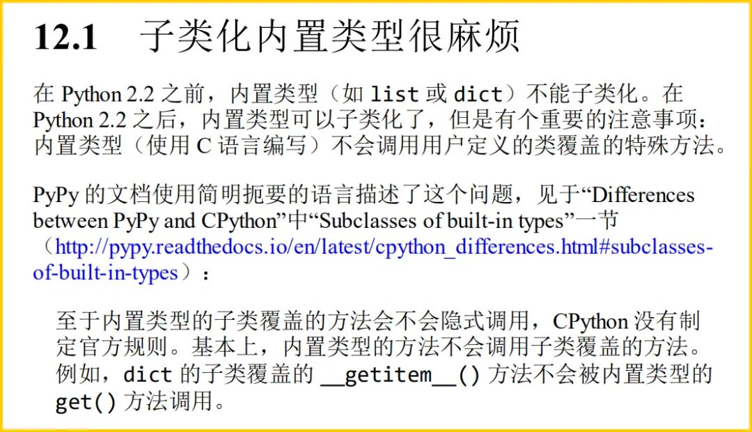 - 违背常识:对于实际是用 C 实现的类(即str、list、dict等等这些内置类型),在显式调用子类方法时,会遵循“子类先于父类”的原则;但是,**在存在隐式调用时,**它们似乎会遵循“父类先于子类”的原则,即通常的继承规则会在此失效