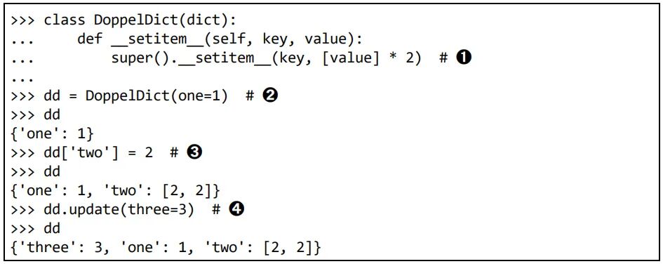 然而,初始化和 update() 直接调用的分别是从父类继承的__init__()和__update__(),再由它们隐式地调用__setitem__()方法,此时却并没有调用子类的方法,而是调用了父类的方法,导致结果超出预期!