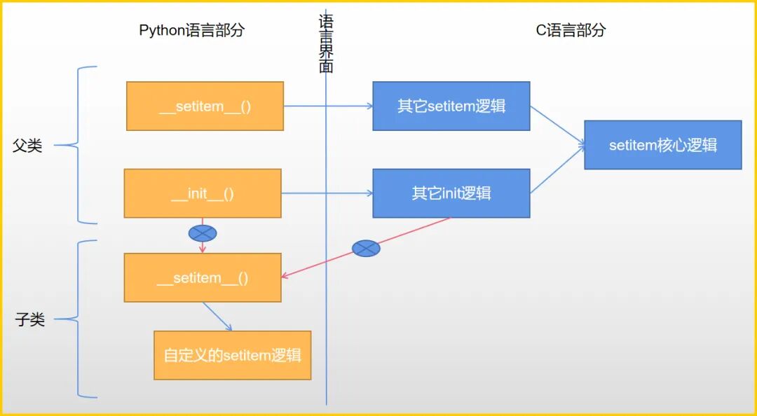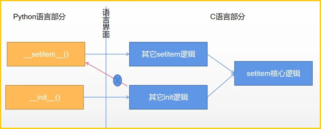 父类的__init__()魔术方法会打破语言界面实现自己的使命,然而它跟子类的__setitem__()并不存在通路,即图中红线路径不可达。