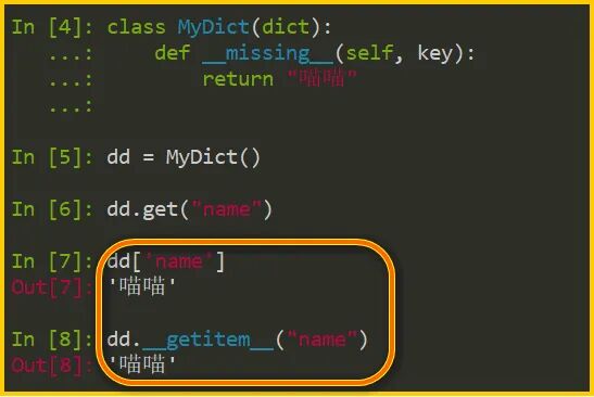 经过初步实验,我发现当子类定义了此方法时,get() 读取不存在的 key 时,正常返回 None;但是 __getitem__() 和 dd['xxx'] 读取不存在的 key 时,都会按子类定义的__missing__()进行处理。